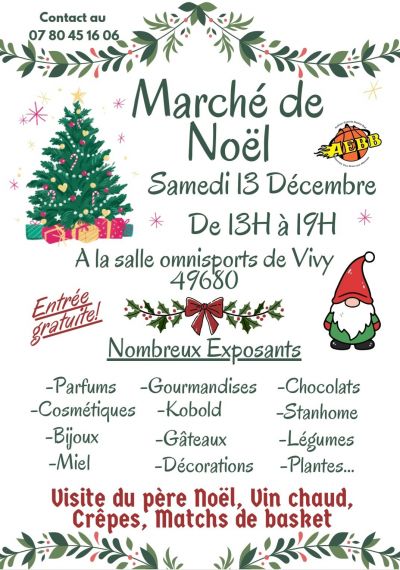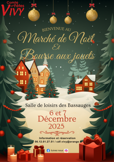 Venez vivre la magie des fêtes de fin d'année au Marché de Noël/Bourse aux jouets organisé par le Comitédesfêtes Vivy 𝐬𝐚𝐦𝐞𝐝𝐢 𝟎𝟔 𝐞𝐭 𝐝𝐢𝐦𝐚𝐧𝐜𝐡𝐞 𝟎𝟕 𝗱é𝗰𝗲𝗺𝗯𝗿𝗲 à la salle de loisirs des Bassauges 🎄