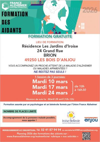 L’association France Alzheimer 49 organise une formation gratuite destinée aux aidants de personnes atteintes de la maladie d’Alzheimer ou d’une maladie apparentée. Ce temps fort se déroulera les mardis 10, 17 et 24 mars de 10 heures à 16 h 30 à la résidence « Les Jardins d'Iroise », 24 Grand’Rue à Brion 😊